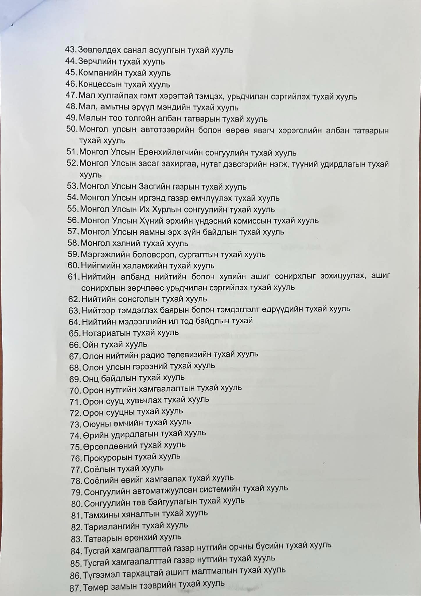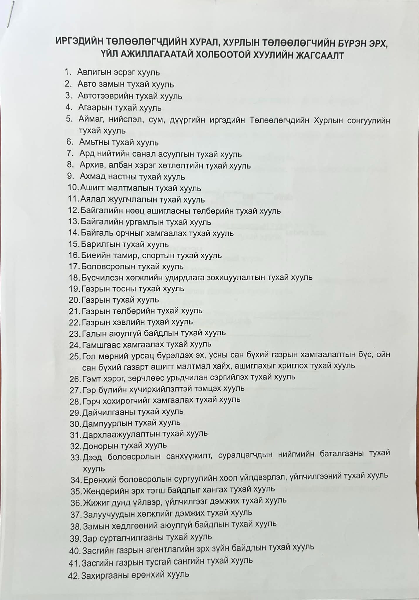 ИТХ, ХУРЛЫН ТӨЛӨӨЛӨГЧИЙН БҮРЭН ЭРХ, ҮЙЛ АЖИЛЛАГААТАЙ ХОЛБООТОЙ ХУУЛИЙН ЖАГСААЛТ